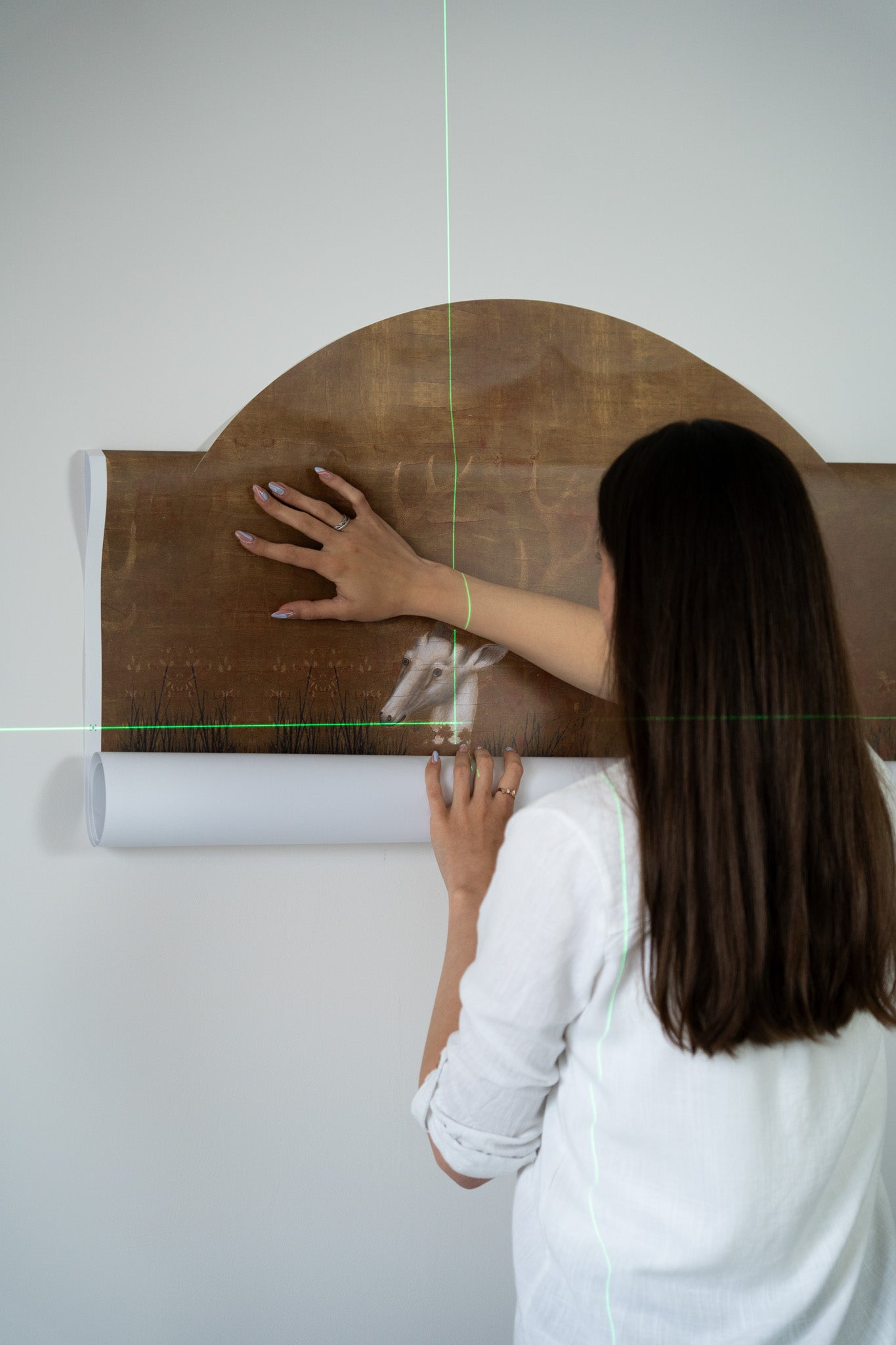 Ziehen Sie von oben beginnend ca. 10 cm der Trägerfolie von der DOTS-Klebeschicht ab. Biegen Sie die Trägerfolie um, platzieren Sie die DOTS so an der Wand, dass die Wasserwaagenlinien mit den Markierungen auf dem Ausdruck übereinstimmen, und kleben Sie den DOTS-Abschnitt an die Wand. Kleben Sie die DOTS von oben nach unten auf und lösen Sie dabei gleichzeitig die Trägerfolie von der Klebeschicht. Drücken Sie die Tapete mit einem Rakel an, um überschüssige Luft zu entfernen. Achten Sie bei jeder Montagemethode darauf, das Material nicht zu beschädigen.